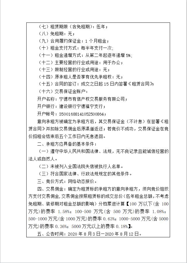 宁德市蕉城区澳风大厦A幢第二、三、四、五、六层办公用房伍年租赁使用权项目信息披露确认表